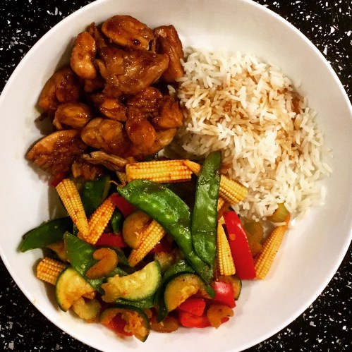 To accompany I chopped up a load of courgette, celery, red pepper, baby corn and mange tout and stir fried with just a bit of tomato puree added in. I served with plain long grain rice and drizzled over the leftover teriyaki sauce.